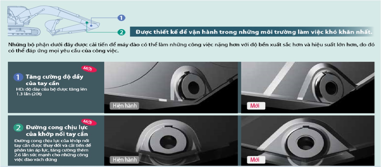 Tại Máy xúc đào Kobelco SK200-10 tay cần được thiết kế khỏe hơn các dòng máy tiêu chuẩn với tuổi thọ được tăng cường, cùng với kiểu dáng mới và tiết diện cần lớn đem lại độ bền vượt trội trong điều kiện làm việc khắc nghiệt. Chi tiết cải tiến bạn có thể xem thêm bên dưới: