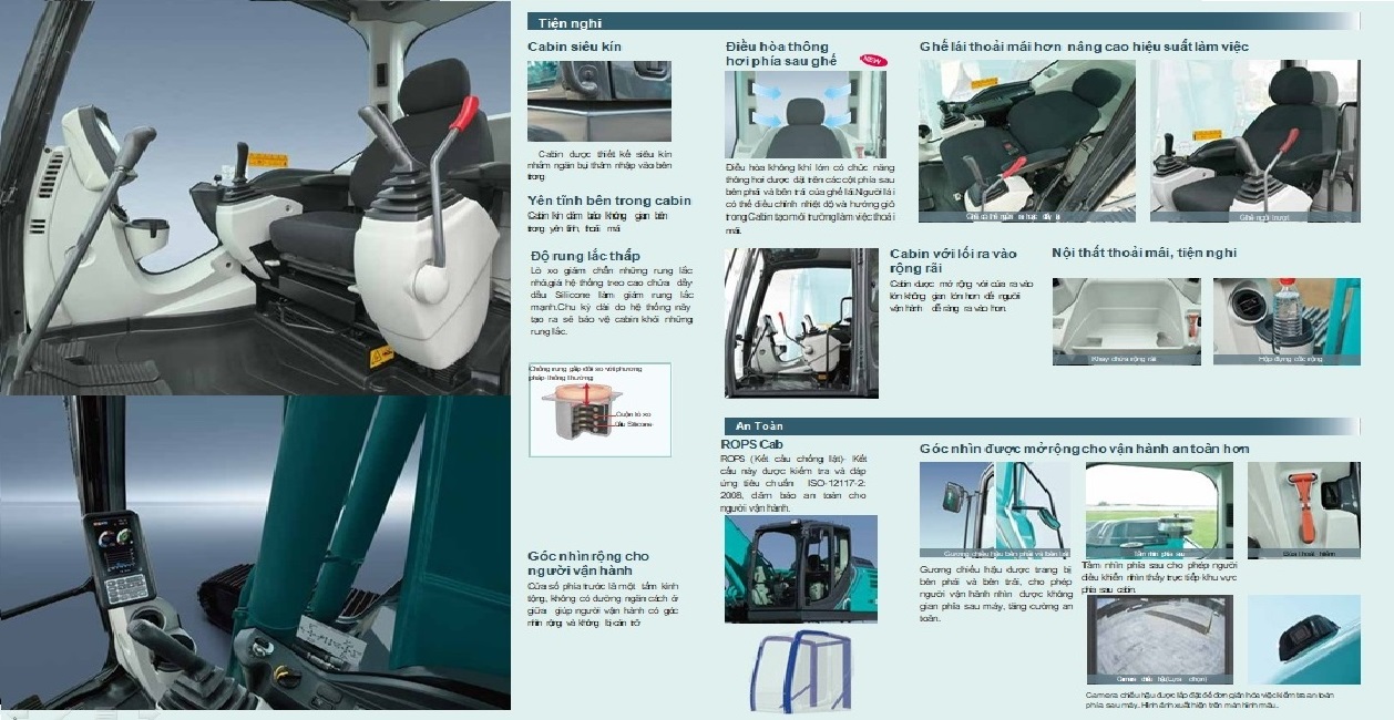 Kobelco luôn xác định tính tiện nghi, an toàn đối với người vận hành luôn là ưu tiên hàng đầu. Vì vậy cabin trên máy xúc đào Kobelco luôn được thợ vận hành đánh giá cao với các chỉ số:
