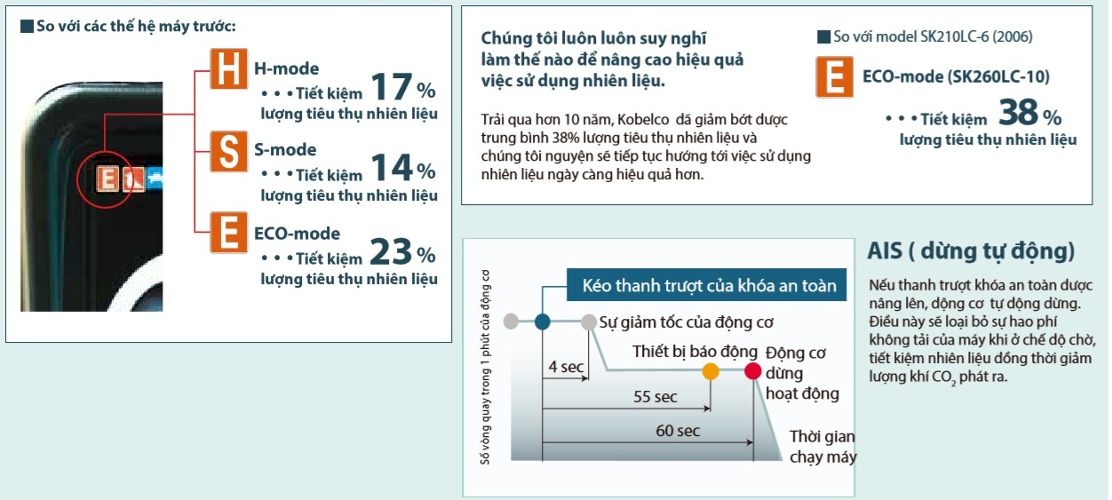 Kobelco SK200-10 mục tiêu tiêu thụ nhiên liệu thấp hơn ở chế độ H-mode/S-mode/ECO-mode so với thế hệ máy Kobelco SK200-8: