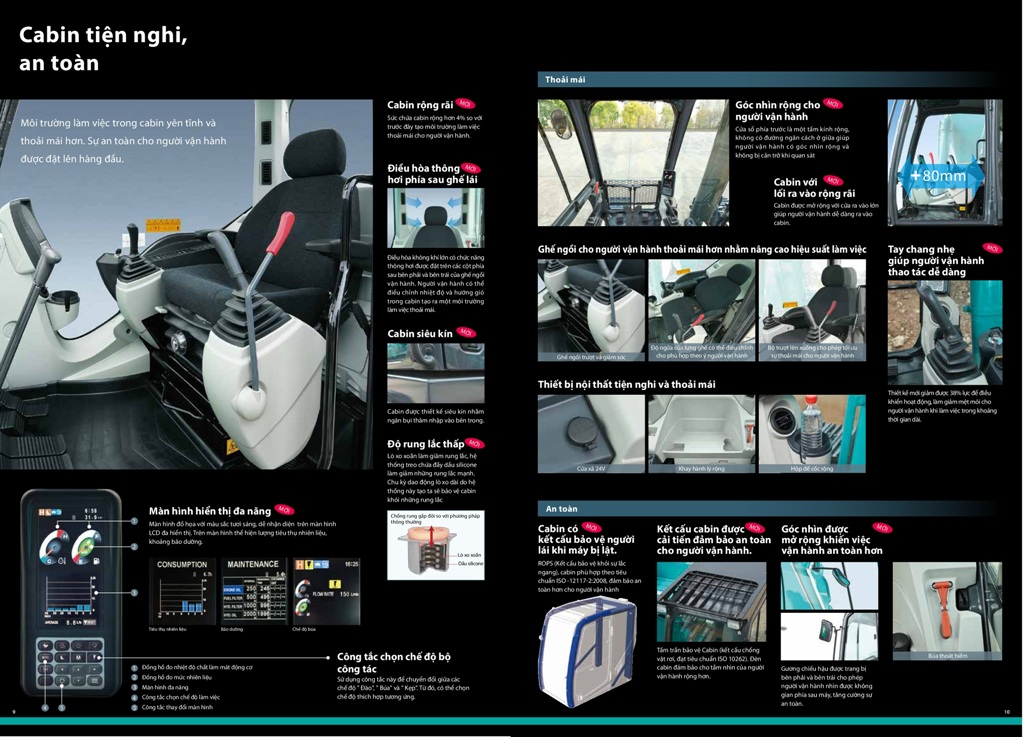 Kobelco luôn xác định tính tiện nghi, an toàn đối với người vận hành luôn là ưu tiên hàng đầu. Vì vậy cabin trên máy xúc đào Kobelco luôn được thợ vận hành đánh giá cao với các chỉ số: